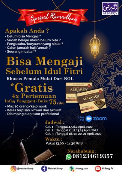 WORKSHOP OFFLINE LITERASI BACA-TULIS AL-QUR’AN BERBASIS PAUD Mengajarkan Baca Qur’an Melalui Bercerita, Bernyanyi dan Bermain (3B) dengan Metode ALBARQY TAHUKAH ANDA? 65% *Data Riset Perguruan Tinggi Ilmu Qur’an (PTIQ) 2018 Muslim Indonesia 65% Belum bisa membaca Al-Qur’an SEPERTI INIKAH KONDISI ANDA SAAT INI? Anda mengalami kesulitan mengajarkan baca huruf Al-Qur’an pada murid/santri anda Masih mengenalkan […]