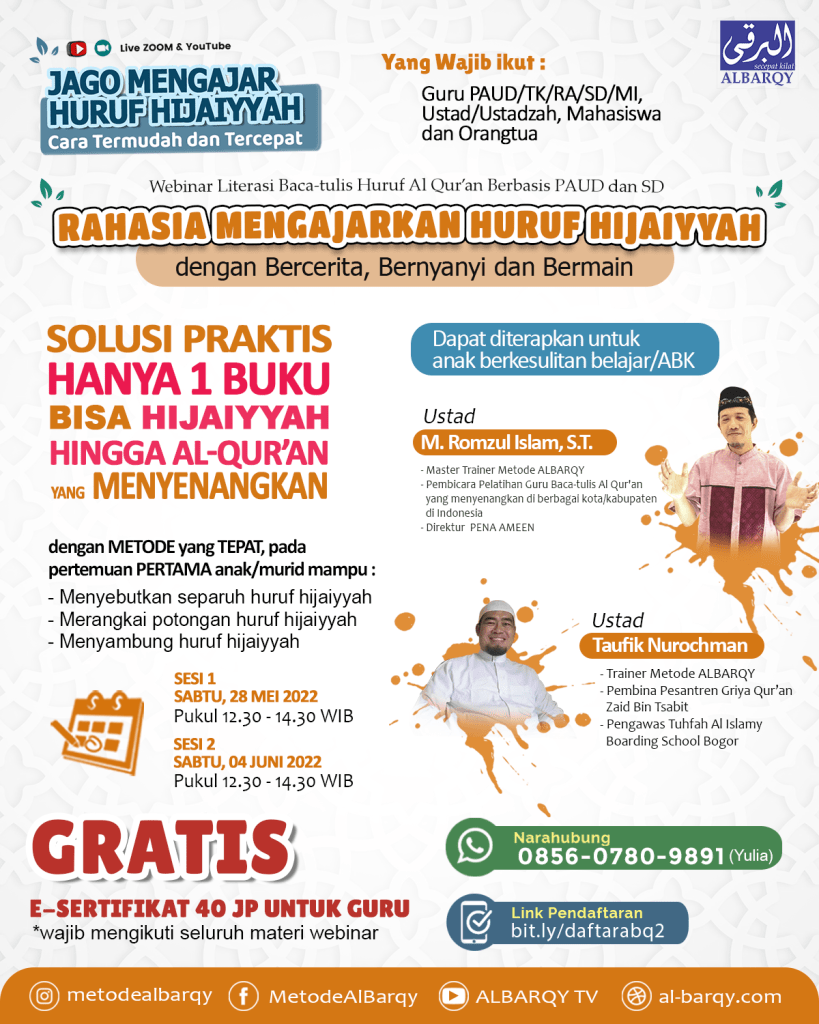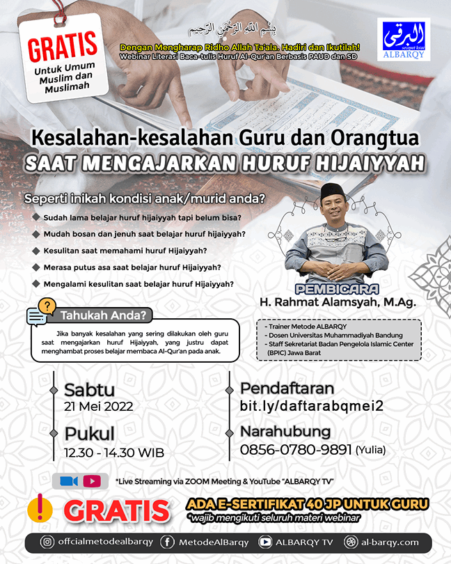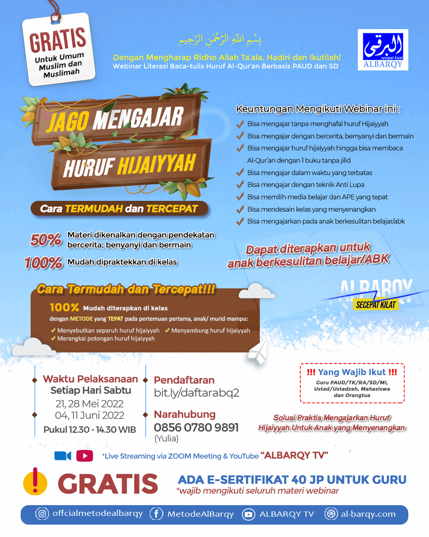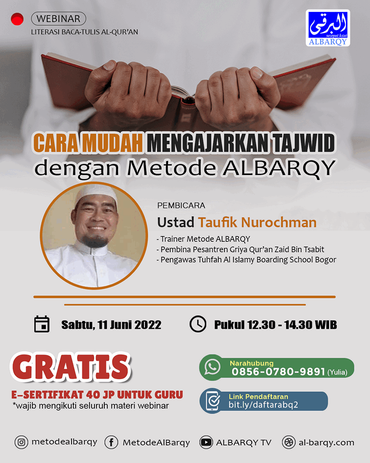 Penemuan Metode ALBARQY membuat kekhawatiran kita menjadi tidak beralasan. Belajar mengaji dengan ALBARQY tidak membutuhkan waktu yang lama seperti dulu, anak-anak SD kelas 4 dapat membaca Al-Qur’an hanya dalam waktu 8 jam saja.